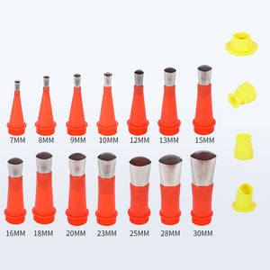 • 14 tailles différentes de buses de calfeutrage de 7 mm, 8 mm, 9 mm, 10 mm, 12 mm, 14 mm, 15 mm, 16 mm, 18 mm, 20 mm, 23 mm, 25 mm, 28 mm et 30 mm, avec 4 bases de connexion, une telle combinaison réfléchie et complète peut satisfaire vos différents besoins de remplissage.